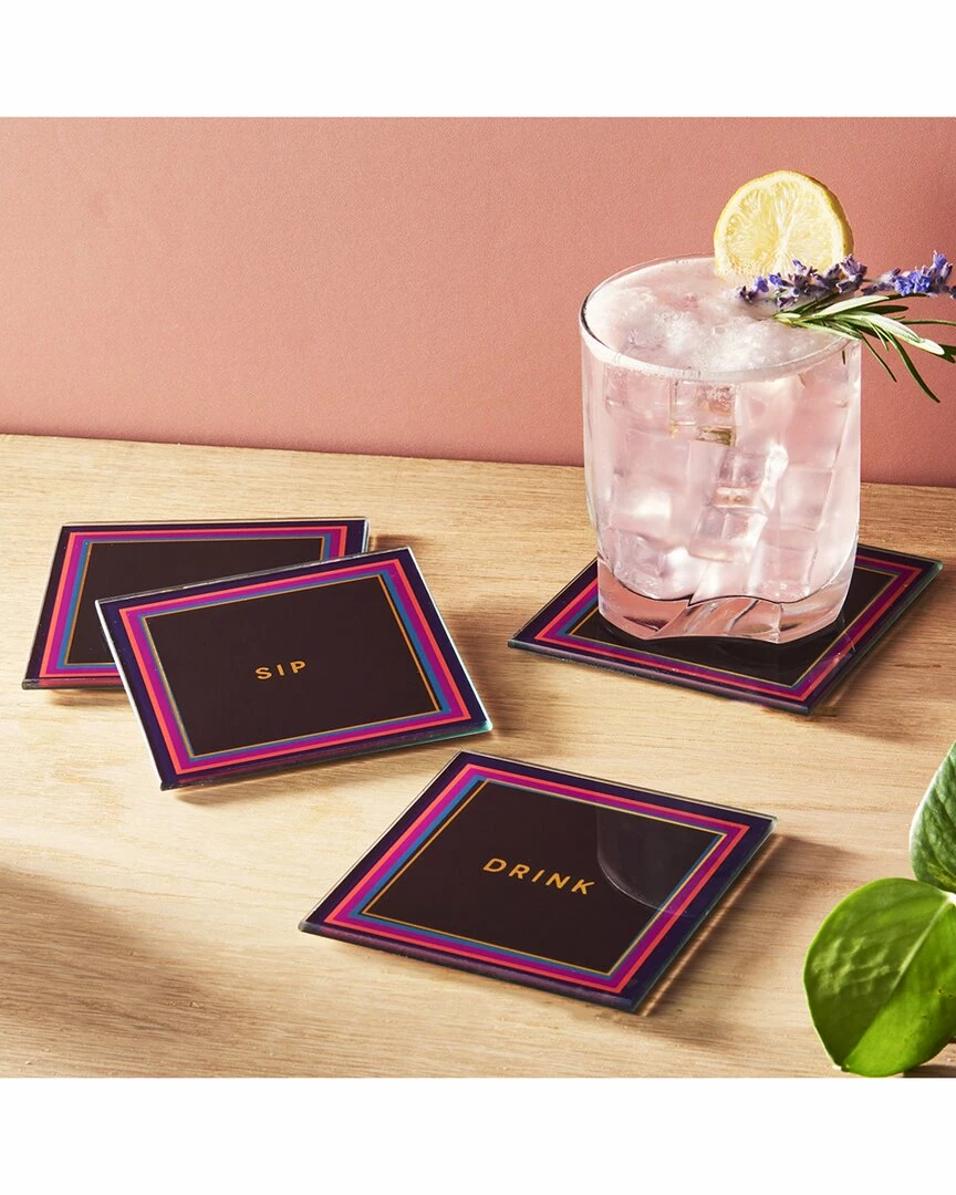 - Design details: avoid that awkward moment when guests place a glass dripping with water beads on your treasured coffee table, forcing you to run for a paper napkin. how? by keeping a set of stylish drink coasters from trina turk cheers to you violet set of 4 glass coaster set 4″d handy! versatile and functional, these beverage coasters prevent water rings from ruining your furniture and a social faux pas from marring your friendship.