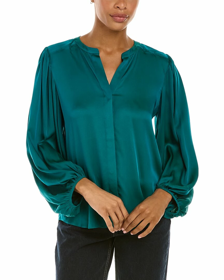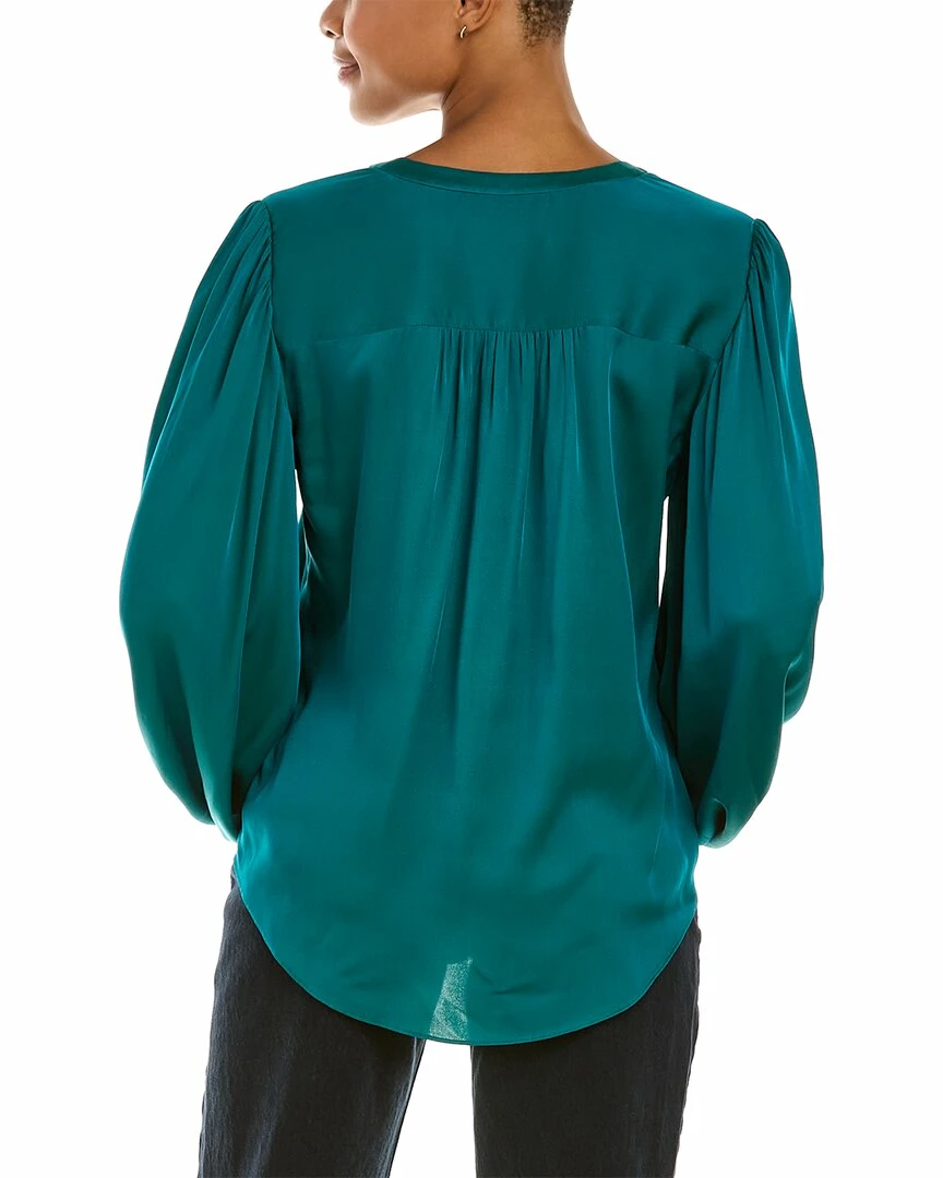- Devilline Silk-Blend Top in magic teal with split neck and blouson sleeves