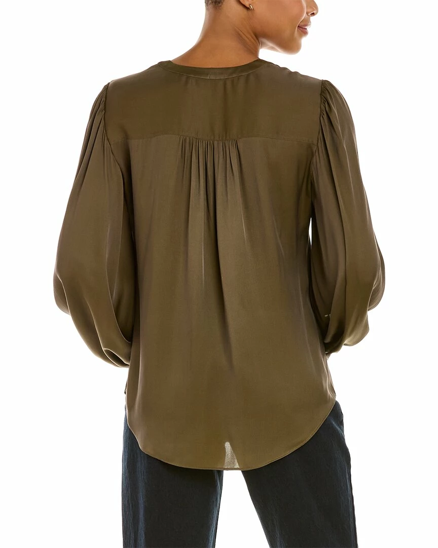 - Devilline Silk-Blend Top in cypress with split neck and blouson sleeves