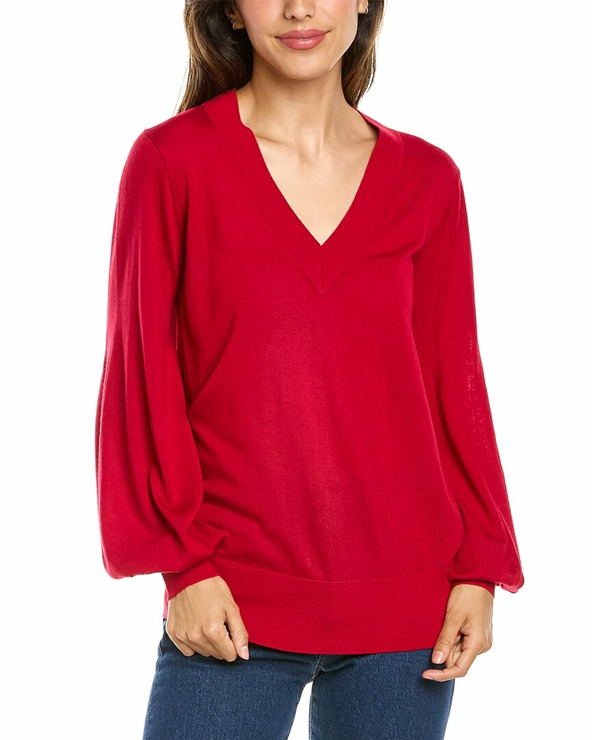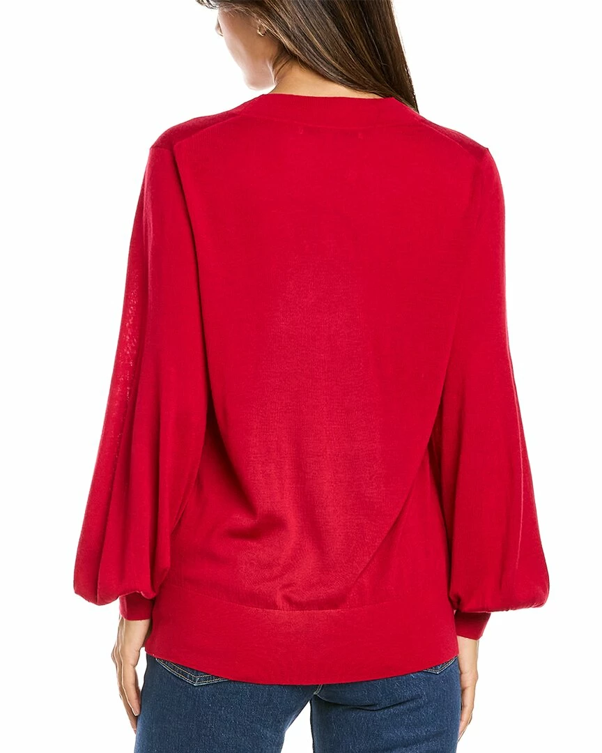- Evening Sun Wool Sweater in sangria with V-neck and blouson sleeves
