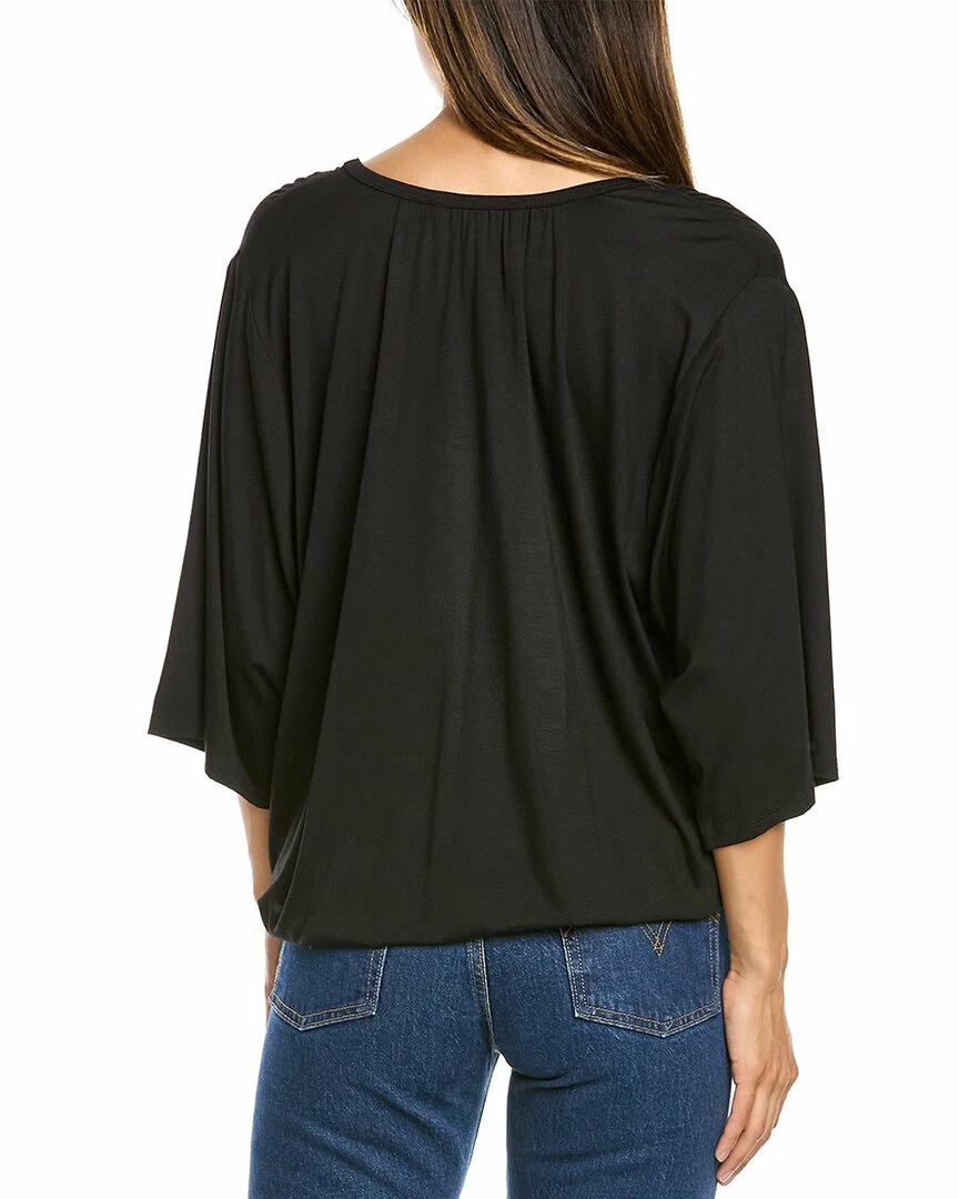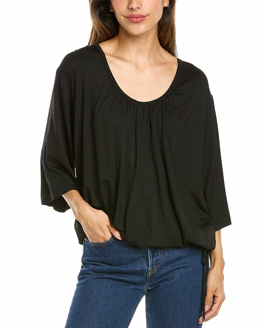 - Illumination Top in black with shirred neck, 3/4-length blouson sleeves, and drawstring hem