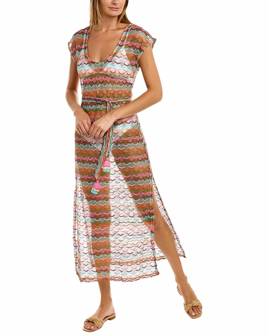 - Isere Column Dress in sugar berry multicolor with sheer lace design, scoop neck, self-tie sash at waist, and side slits at seams