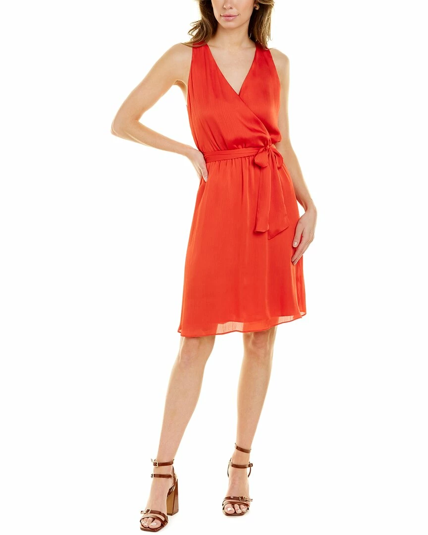- Planetary Dress in lava with surplice bodice, tie sash at waist, and gathered waist