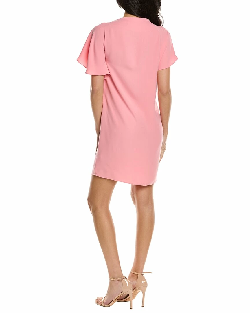 - Promising Shift Dress in desert rose with asymmetrical neckline, tucks at right shoulder, and elbow-length left sleeve