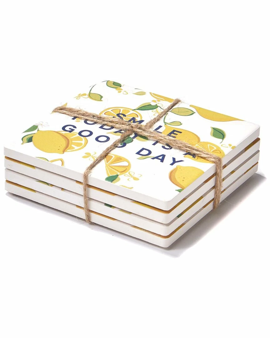 - Design details: avoid that awkward moment when guests place a glass dripping with water beads on your treasured coffee table, forcing you to run for a paper napkin. how? by keeping a set of stylish drink coasters from trina turk squeeze the day set of 4 ceramic coasters 4.25”d handy! versatile and functional, these beverage coasters prevent water rings from ruining your furniture and a social faux pas from marring your friendship.