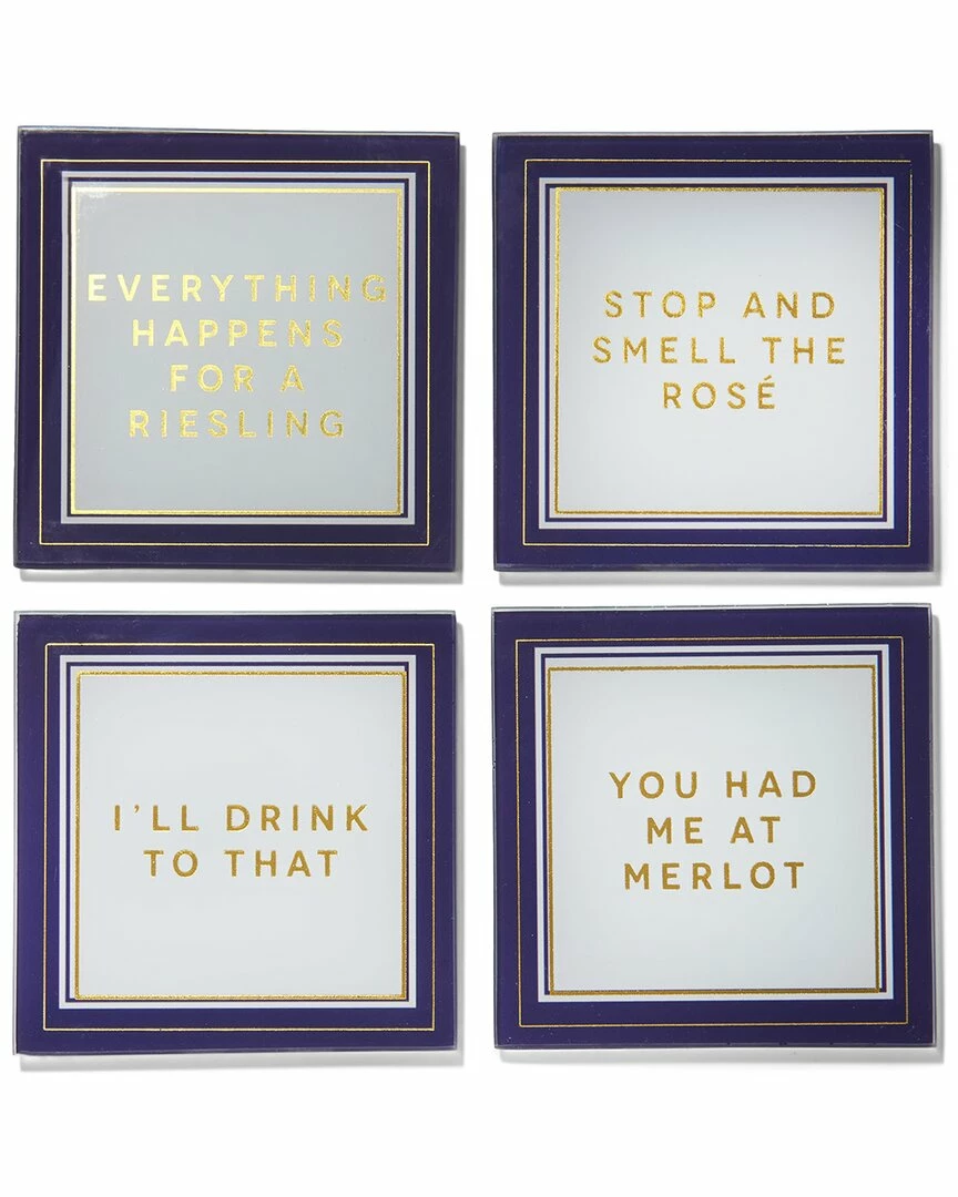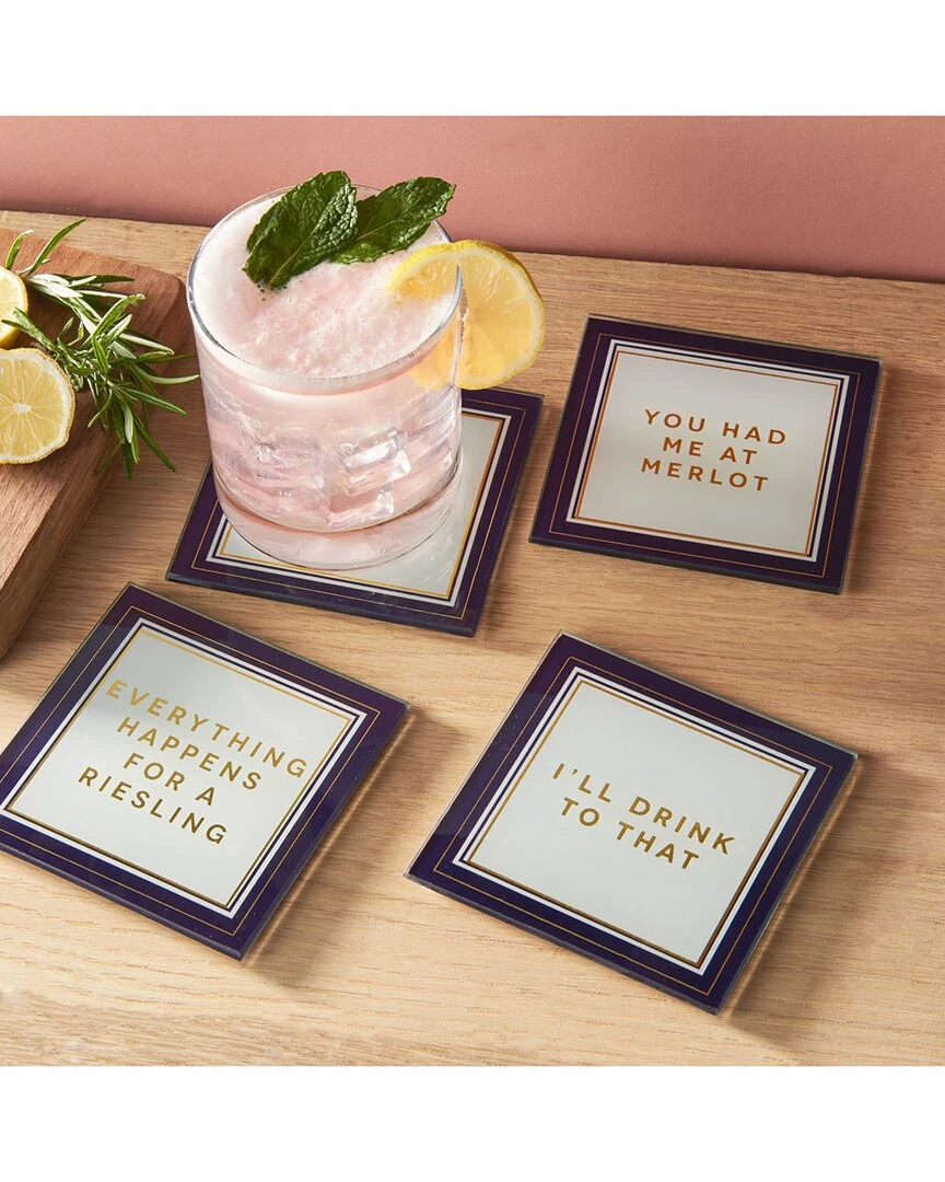 - Design details: avoid that awkward moment when guests place a glass dripping with water beads on your treasured coffee table, forcing you to run for a paper napkin. how? by keeping a set of stylish drink coasters from trina turk wine enthusiast black set of 4 glass coaster set 4″d handy! versatile and functional, these beverage coasters prevent water rings from ruining your furniture and a social faux pas from marring your friendship.