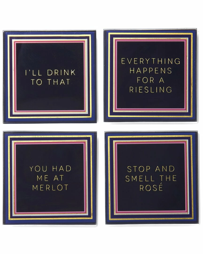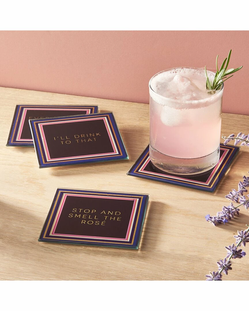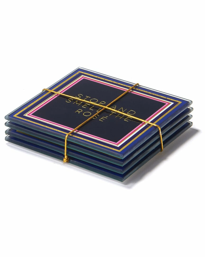 - Design details: avoid that awkward moment when guests place a glass dripping with water beads on your treasured coffee table, forcing you to run for a paper napkin. how? by keeping a set of stylish drink coasters from trina turk wine enthusiast blue set of 4 glass coaster set 4″d handy! versatile and functional, these beverage coasters prevent water rings from ruining your furniture and a social faux pas from marring your friendship.