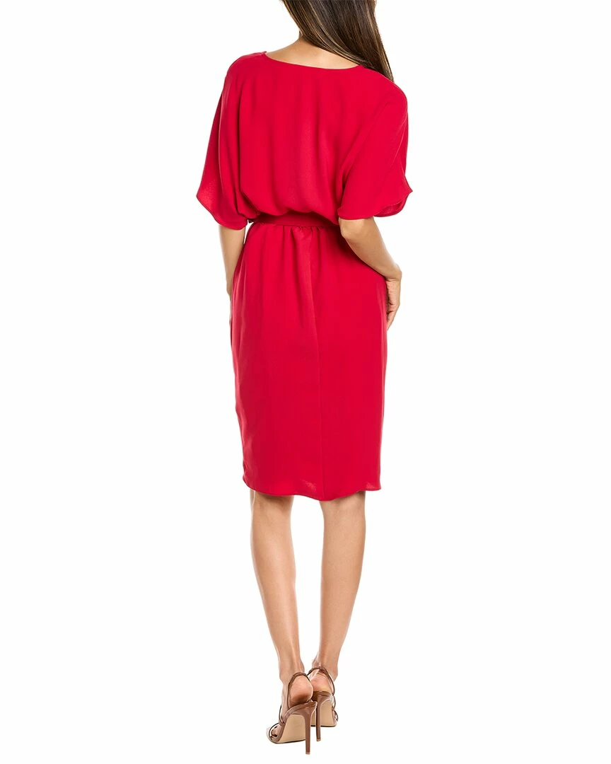 - Zest Dress in sangria with surplice neck, ruched skirt front, belted waist, and high-low hem
